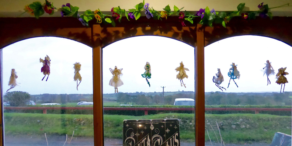 After our visit to Monasterboice we had lunch at Maguire’s of Tara, a popular restaurant in County Meath where handcrafted fairies dangle from window frames and ceiling beams. The sign outside noted that we were at the Hill of Heroes. Many still believe that the Curse of Tara bodes disaster for any who dare disturb the fairy mounds there.
