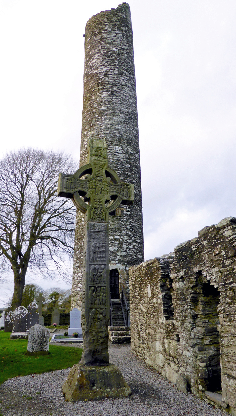 One of the tallest round towers and two of the best preserved High Crosses in Ireland, all from the 10th century, are found at Monasterboice. The crosses are decorated with art that was used to teach Biblical stories.
