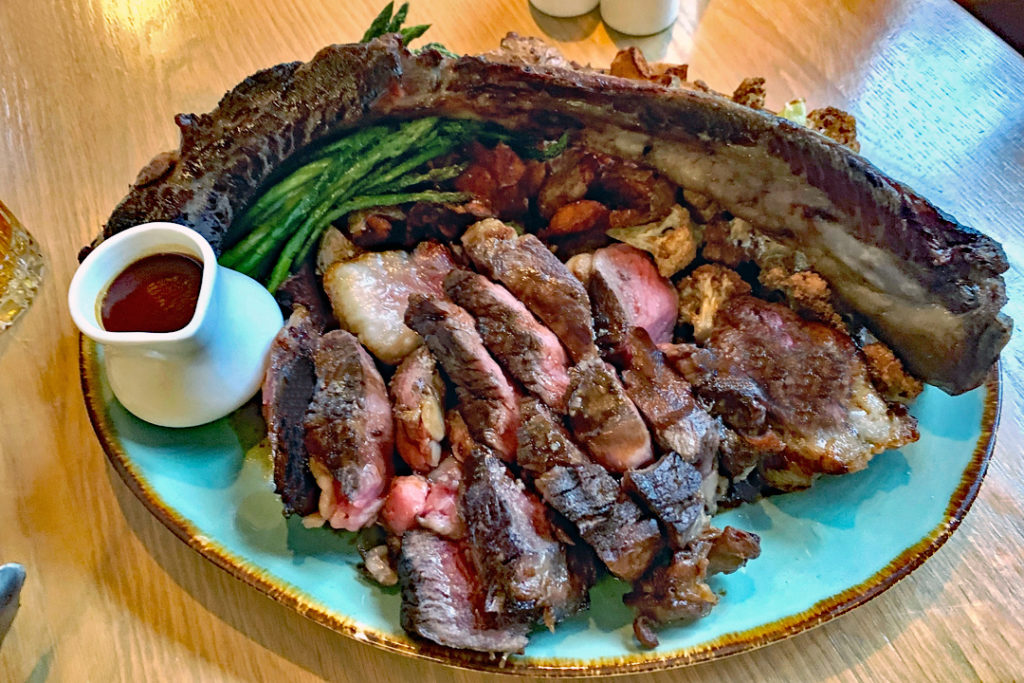 The full range of options is topped by the 30 ounce Tomahawk Steak for two. It is accompanied by pepper sauce, Gabrielle fingerling potatoes from Québec’s Île d’Orléans, asparagus and fried cauliflower.