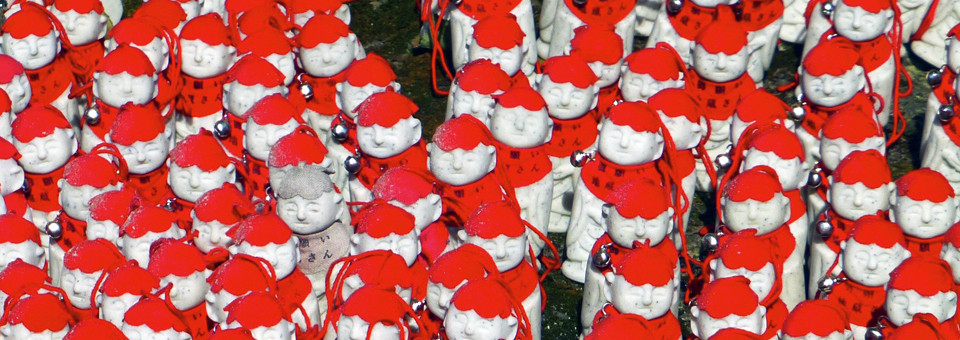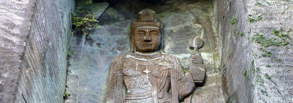 The mountain’s Nihonji Daibatsu (Great Buddha) holds a bowl with his left hand and his right hand palm upward, a common pose of a Medicine Buddha. Viewing the Medicine Buddha is said to be beneficial to health. At 31.05 meters (101.9’) it is one of the largest stone images of Buddha in Japan. It was completed in 1783 and restored in 1969. The mountain’s 1500 Rakan (disciples of Buddha) were created during the same period.