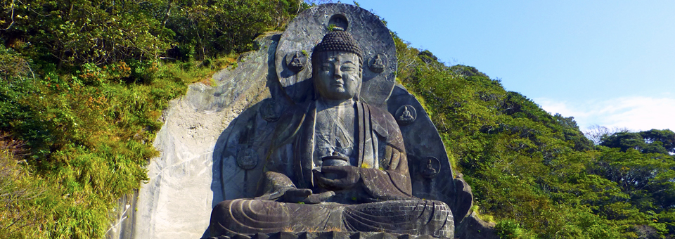 Mt. Nokogiri is the site of Nihonji, a Buddhist temple founded in 725 under orders from Emperor Shomu. Hundred-shaku Kannon, the Goddess of Mercy, is carved into the face of the mountain. She holds holds a spade in one hand. A shaku is 30.3 cm., or 11.93 inches, making the goddess 30.3 meters or nearly 100’ tall. Those with difficulty hiking on steep uneven terrain may want to avoid the hiking trail approach.
