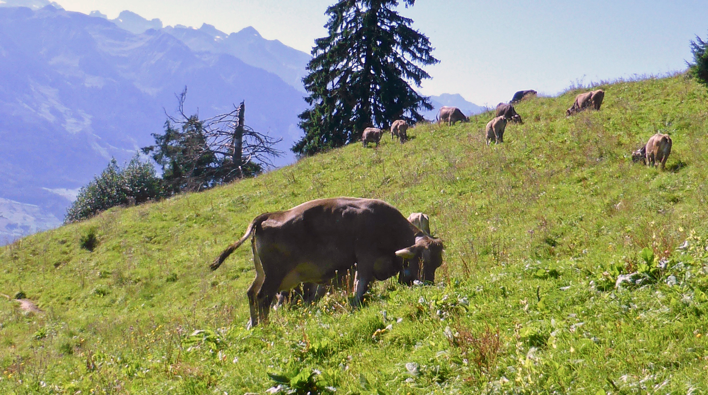 What a ride to the 7000’ high summit! There was a bird’s eye view of the lake and city, sights and sounds of mountain streams, and a stop to watch cows grazing on alpine flowers.