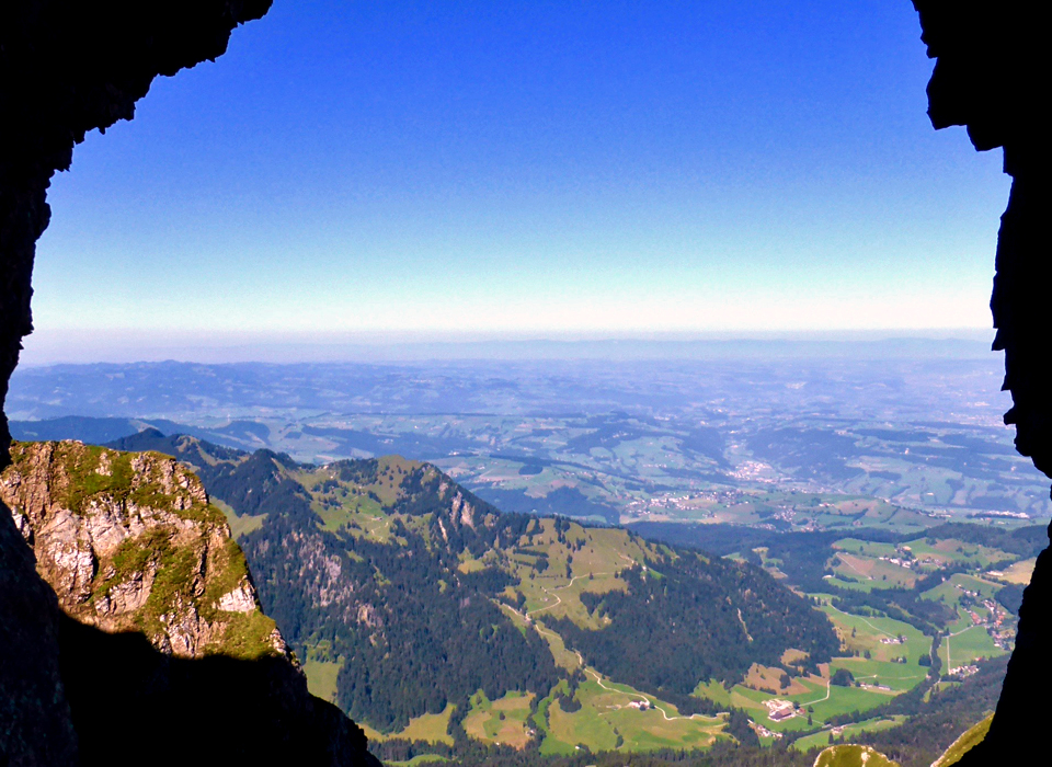 view through one of the cutouts in the tunnel through the summit area of Mt. Pilatus