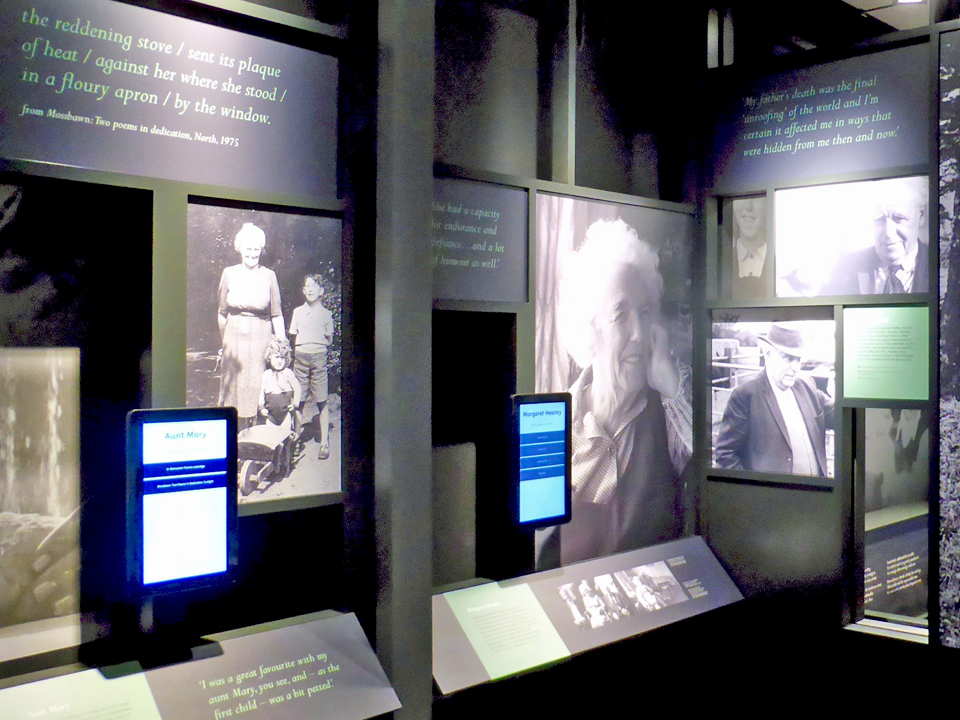 There are family portraits, interactive exhibits, personal stories and artifacts, and recordings from family, his parents, Patrick and Margaret, brother, Hugh, and Aunts Mary and Sarah, his wife, and children as well as friends, world leaders, and Heaney himself. Many of the artifacts were provided by his widow and children.