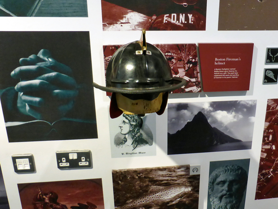 The upstairs floor is devoted to inspiration what inspired the poet. The Boston helmet, for example, belonged to Boston firefighter Bobby Breen, who was immortalized in Heaney’s poem “Helmet.” After his retirement, Breen went on to be an award-winning poet.