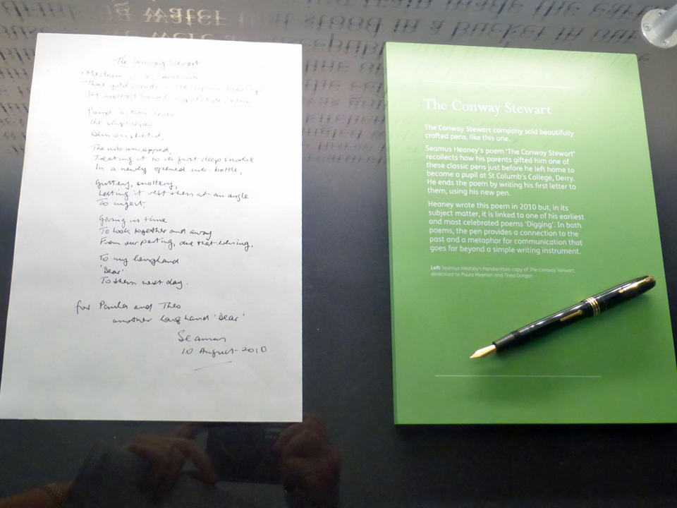 Heaney’s poem “The Conway Stewart” is on display.alongside a pen like the one his parents gave him before he left to study at St. Columb’s College in Derry.
