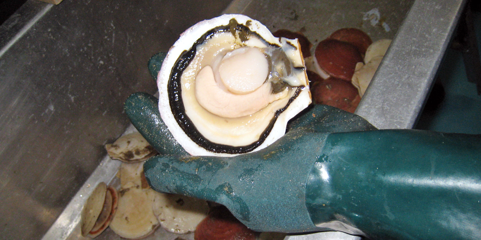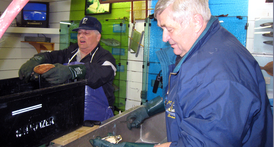 Norman Keizer (foreground) and Wallace Skinner, scallop shucking champions at the Fisheries Museum of the Atlantic, Lunenburg