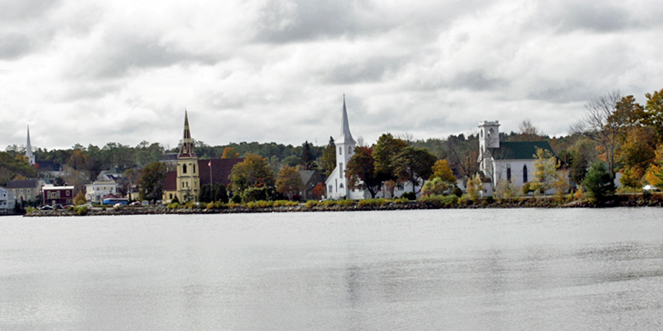 Waterfront church steeples stand like beacons to sailors in the iconic skyline of Mahone Bay.