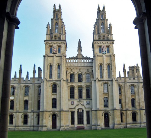 All Souls, with elaborate twin towers and an impressive iron gate, was established to pray for the souls of English soldiers in the 14th-15th centuries, around the time of Joan of Arc.