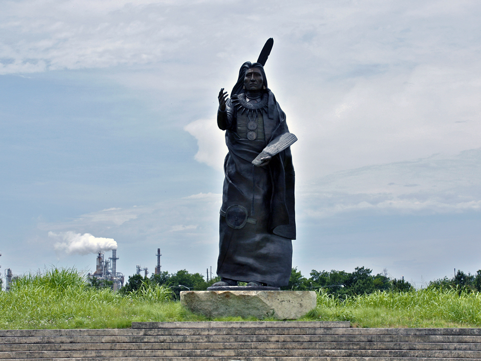 In 1996, a 22’ bronze statue of Ponca Chief Standing Bear was unveiled, facing east to the rising sun to symbolize new beginnings.