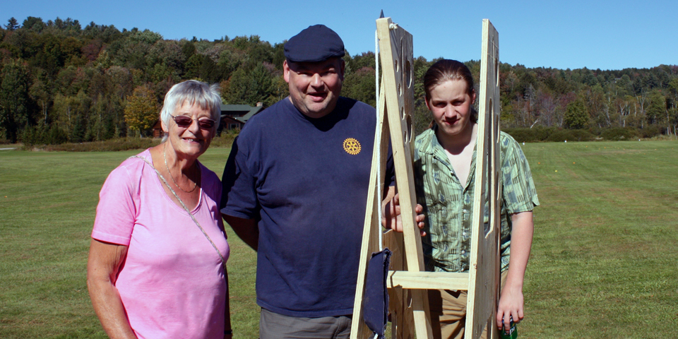 Delia Blackman from the Isle of Wight, her son, Rotary member and competitor, Justin Blackman, and his teammate, Vaughn Winter at the Vermont Pumpkin Chuckin’ Festival, Snowflake Mountain Resort & Spa, Stowe, Vermont