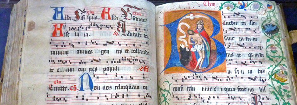 The library is on the north side where temperatures are cooler and more constant throughout the year. Hand-lettered and illustrated books are on display. Fragile manuscripts are preserved elsewhere.