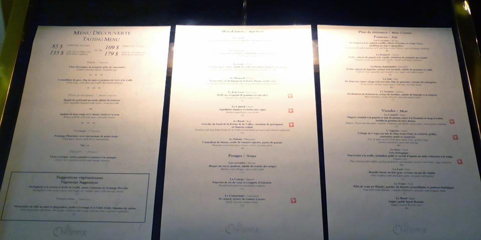 The restaurant has been awarded many culinary distinctions, including numerous Grand Prix di Tourisme awards. Chef Mario Chabot incorporates Charlevoix products into his menu, including the Host Table dinner ($54 CAD).