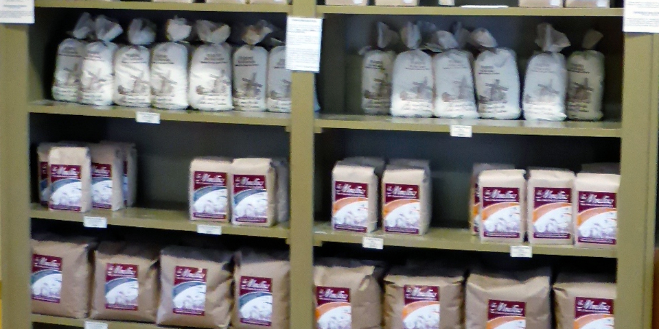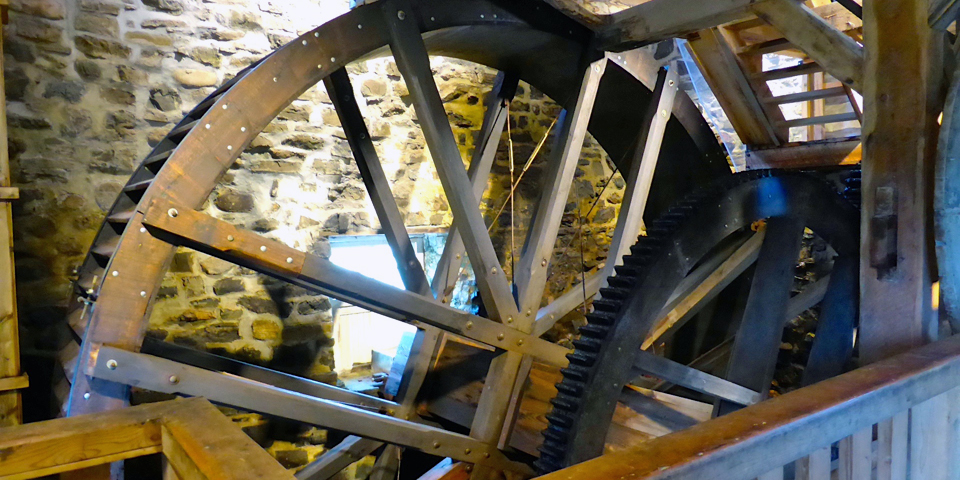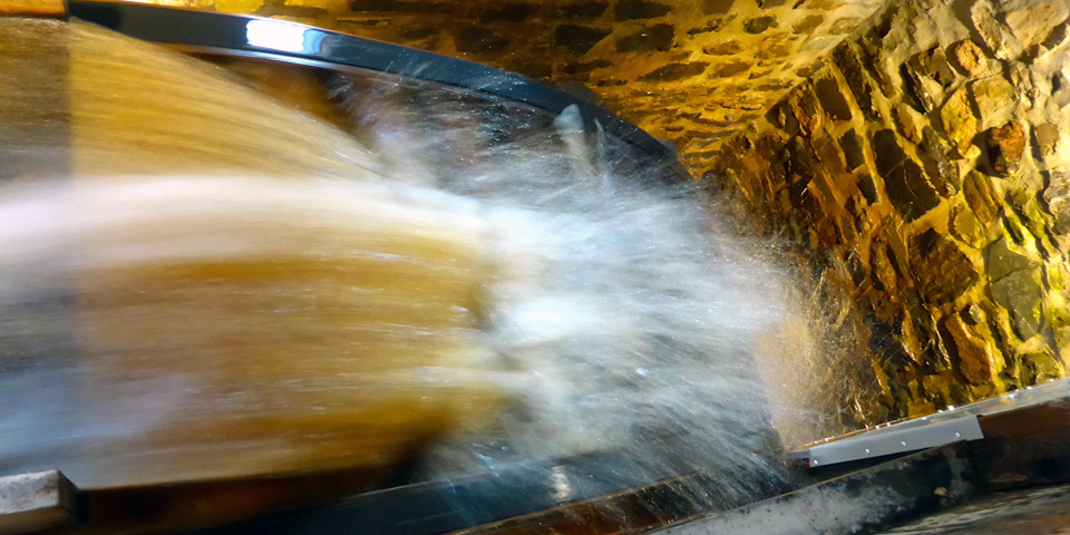Organic wheat is ground into flour as gushing water turns the gears of a watermill that dates to 1827.