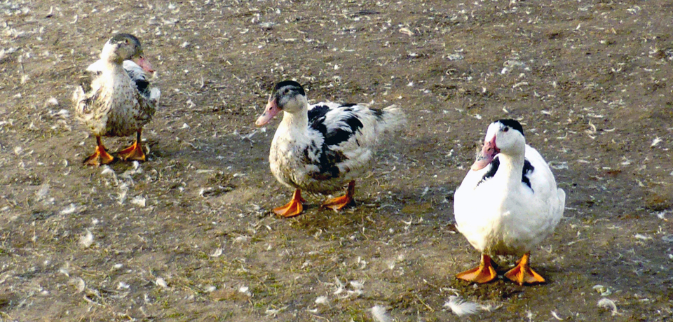 Moulards, a special breed of male Muscovy and female Pekin ducks with a chest pouch for storing extra food, strut freely at Isabelle Mihura and her husband Jean-Jacques’ Etcheberrigaray’s La Ferme Basque de Charlevoix in Saint-Urbain.
