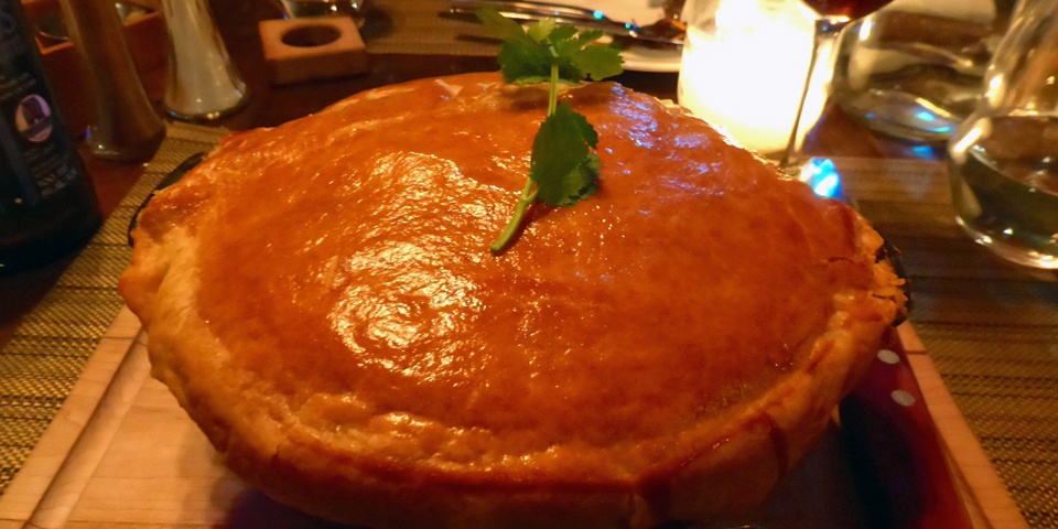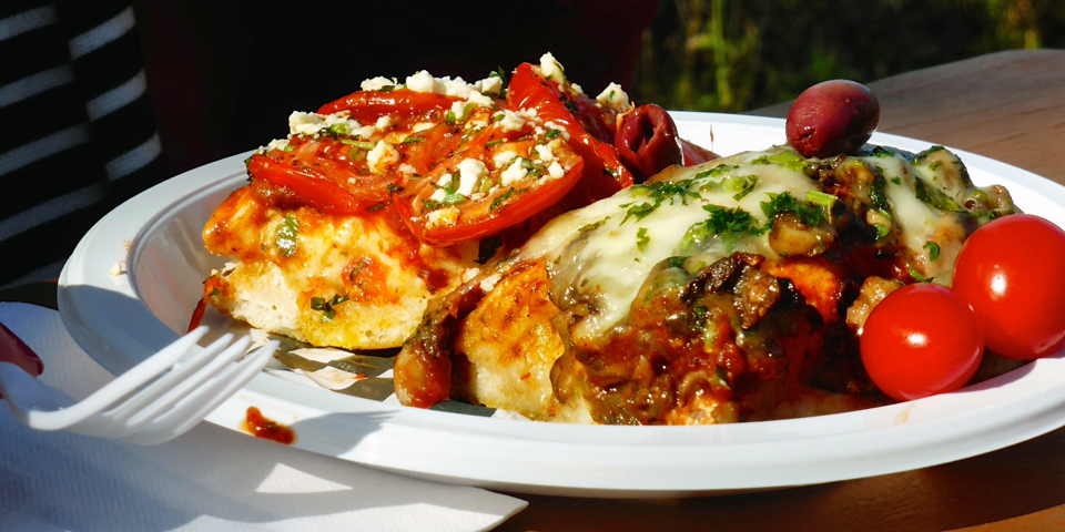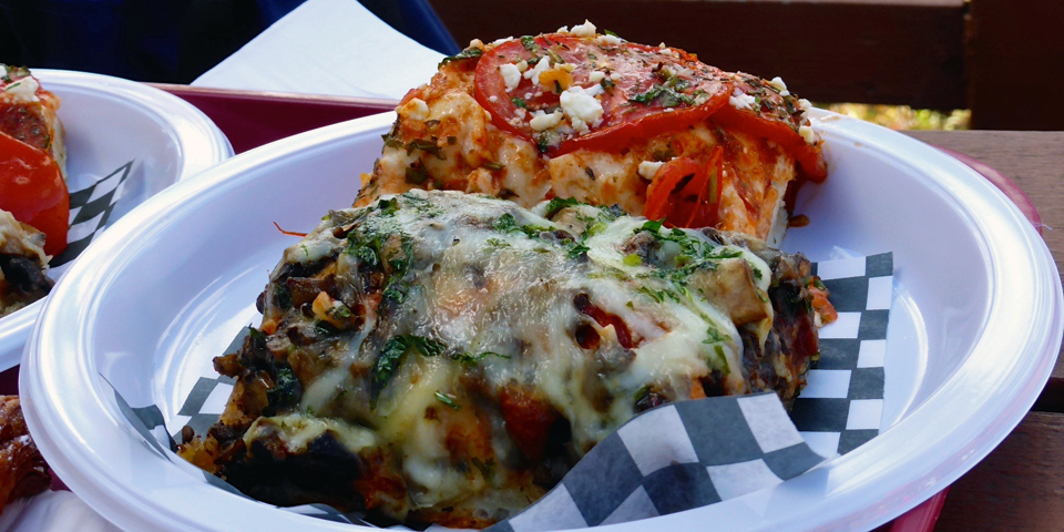 lasagna at the picnic tables outside Boulangerie Bouchard,l’Isle-aux-Coudres, Charlevoix, Quebec, Canada