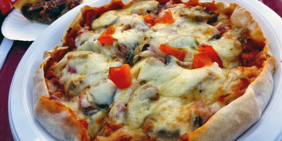 pizza at the picnic tables outside Boulangerie Bouchard,l’Isle-aux-Coudres, Charlevoix, Quebec, Canada