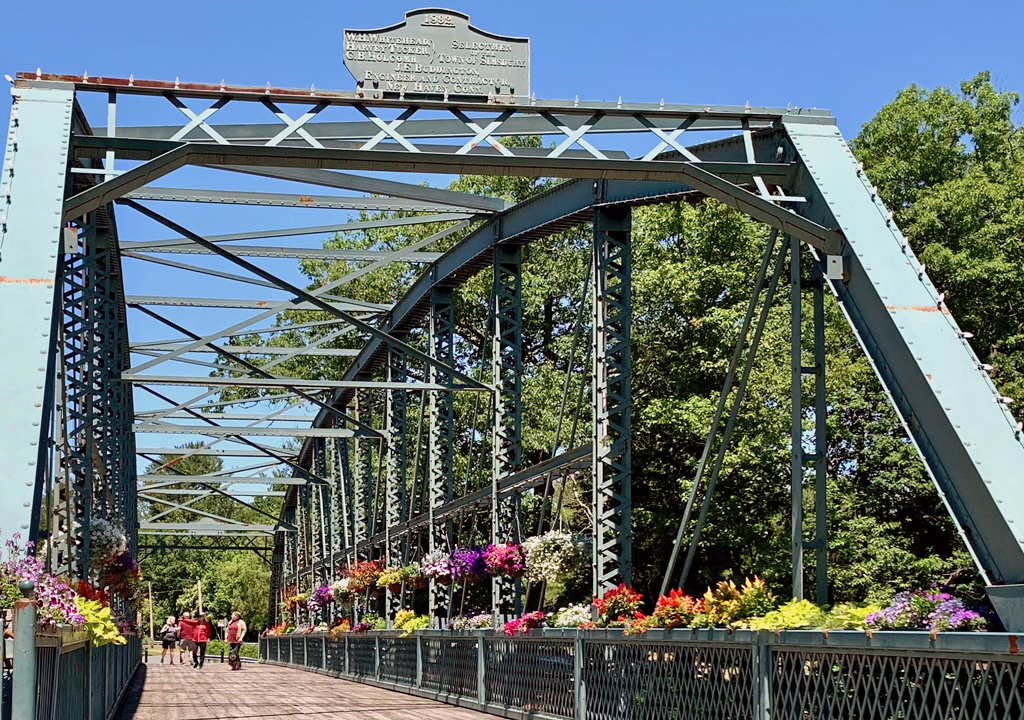 The Old Drake Hill Flower Bridge was built in 1892 and rehabbed a century later for pedestrians and bicyclists. Decorated with flower boxes, hanging baskets and flower columns and maintained by volunteers, it was inspired by the Bridge of Flowers in Shelburne Falls, Massachusetts. As one of three surviving steel Parker truss bridges in Connecticut it is on the National Register of Historic Places and is less than half a mile from the inn.