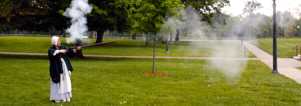 George Rogers Clark National Historical Park personnel like Pamela Nolan reenact these struggles, and Clark’s accomplishments are commemorated with an impressive 80’ classic granite monument. Inside, a bronze statue of Clark is surrounded by murals and an inscription that reads “Great things have been effected by a few men well conducted”.