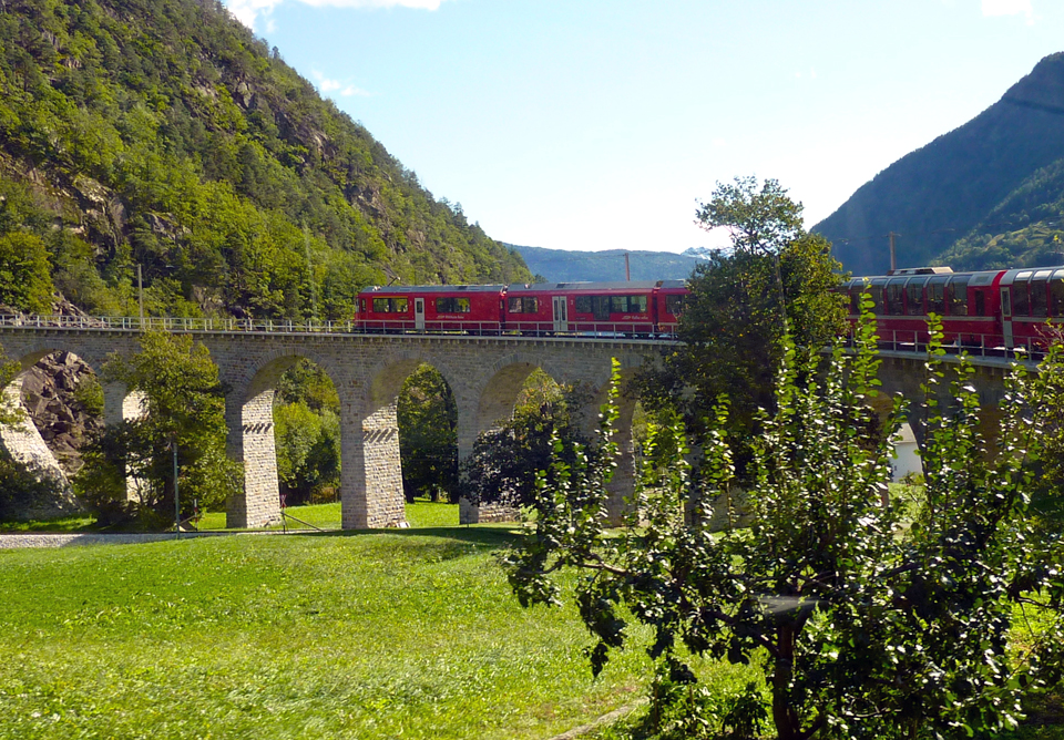 One of the best ways to get there is over viaducts and through helical tunnels along the Rhaetian Railway’s narrow gauge Albula Railway, a UNESCO World Heritage Site. The area and its railway is best known for its Glacier Express and Bernina Express trains, two of the most scenic train trips in the world.