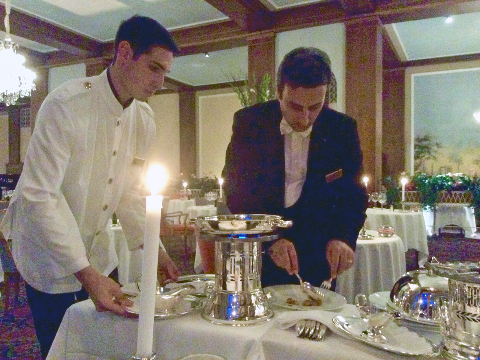 There is superlative gueridon service in Le Restaurant, a dining room that dazzles with chandeliers, crystal and silver.