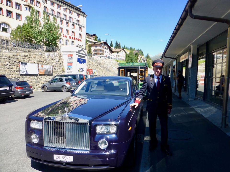 Badrutt’s Palace guests arriving at Samedan airport or the train station in St. Moritz can enjoy white gloved chauffeur service in one of their Rolls-Royce limousines.