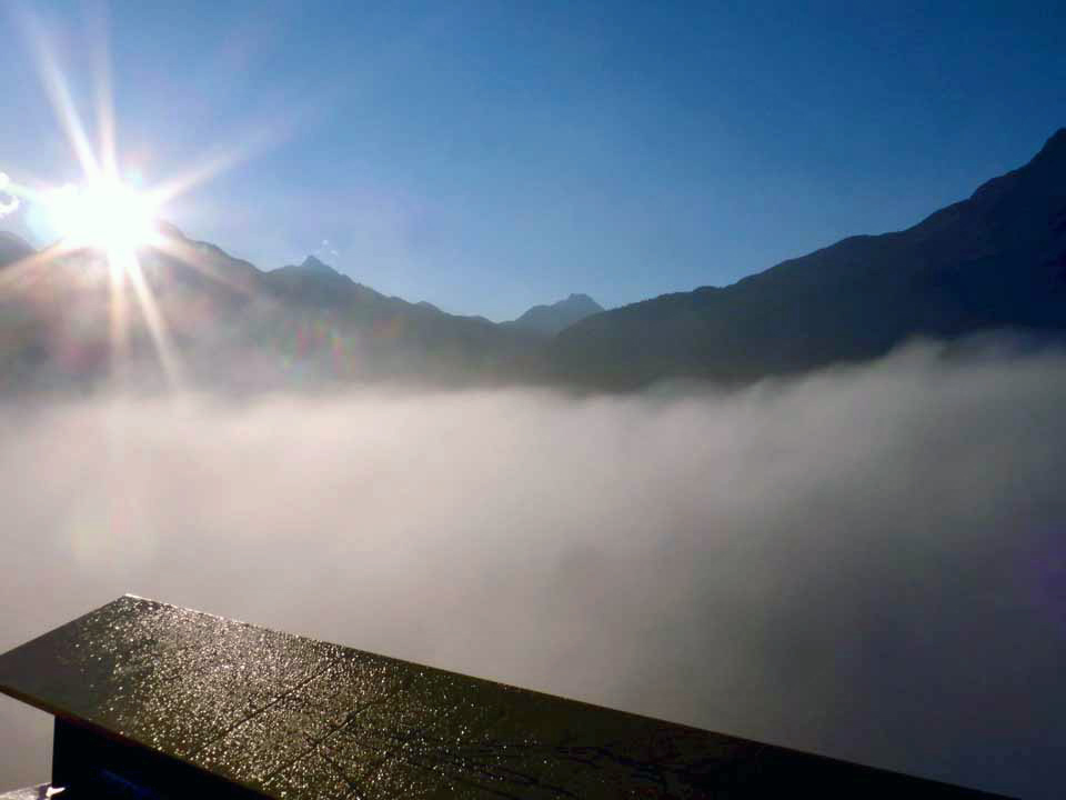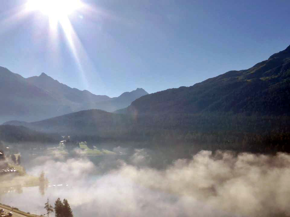 The clouds rise slowly to reveal a lake that sparkles like diamonds and a reflection of the sunlit Swiss Alps.