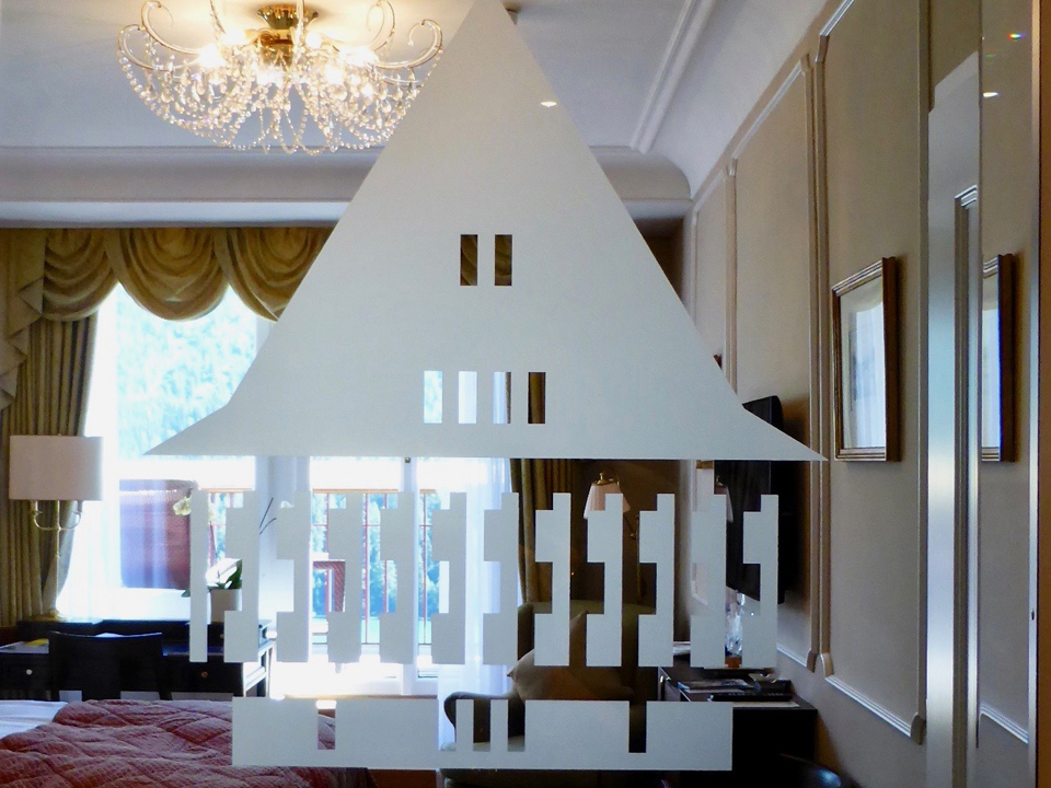 tower logo on door separating the foyer area from the guest room, Badrutt’s Palace, St. Moritz, Switzerland.
