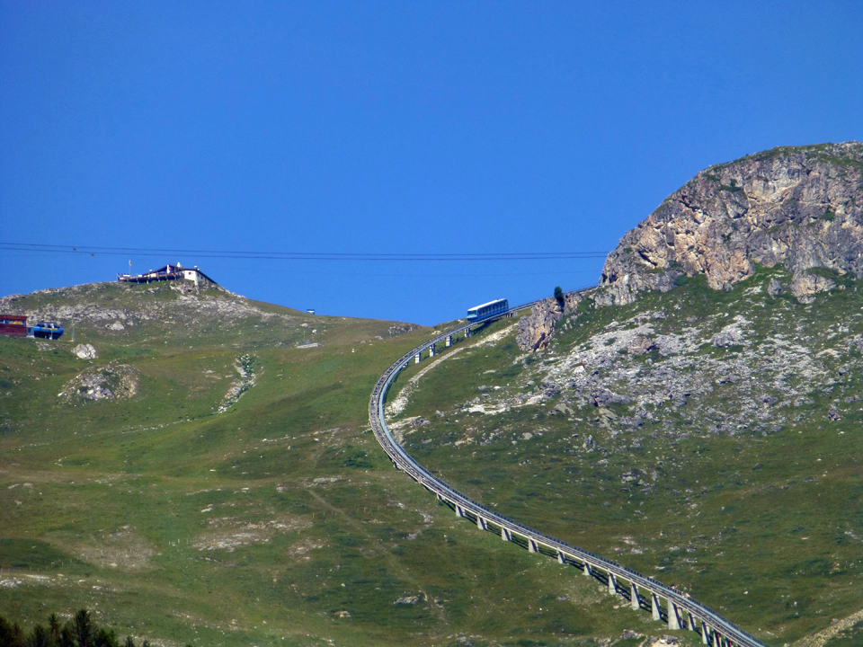 There is an ice cave at Piz Corvatsch, and, it is said, fairies and a ghost at Morteratsch Glacier. The view of the glacier landscape of mountains, lakes and valleys from the 8058’ high Muottas Muragl is spectacular.