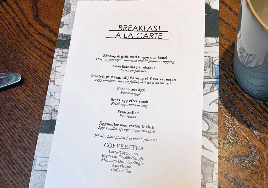 The room rate includes an à la carte menu as well as a bountiful breakfast buffet of traditional and Nordic favorites. Breakfast is served in the urban-chic brasserie, which is also a locally popular spot for lunch, dinner and weekend brunch.