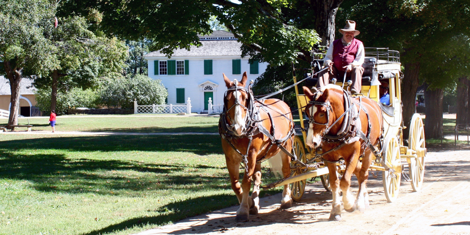 The sound of a horse-drawn stagecoach, the kind that carried mail and passengers between New England towns foreshadows the emerging view of a village common where costumed historians bring it all to life.
