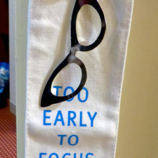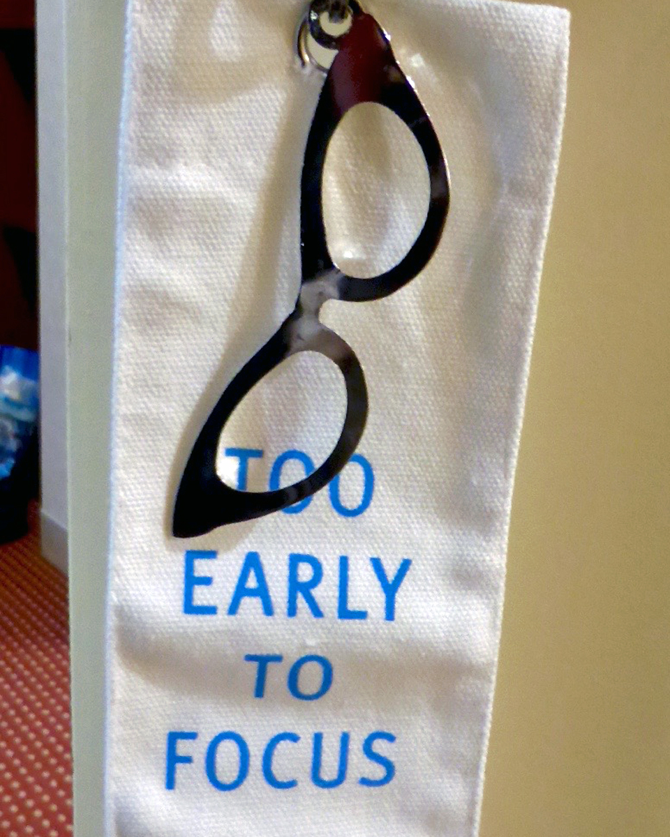 A “Too Early to Focus” card with a plastic eyeglass frame dangled from the doorknob. No conventional “Do Not Disturb” sign here!