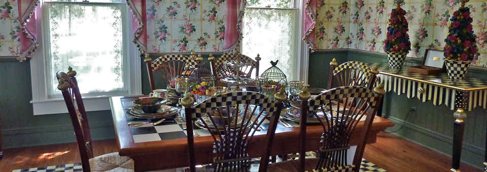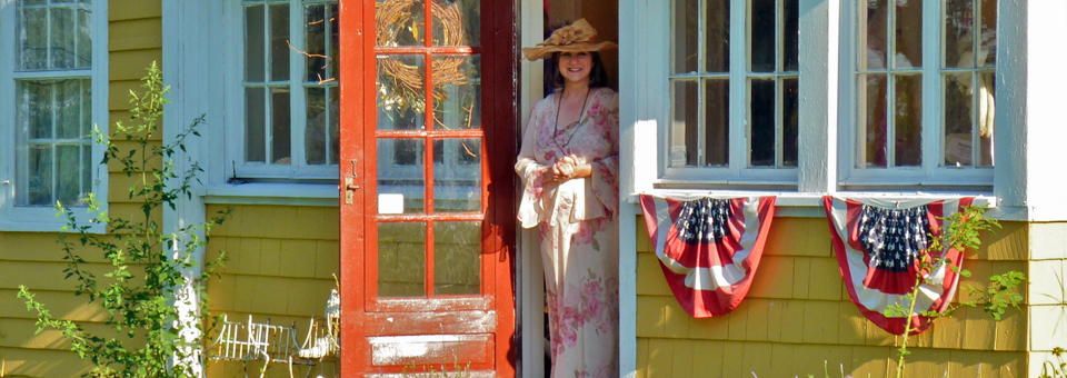 We dined on an elegantly presented local specialty, buckwheat pancakes, and much more at her Grandma Hattie’s Tea Party in Miss Lillian’s Tea Room, shown in the former location in the Ichabod Town Homestead, but now on Main Street. Retired primary school principal Kathleen Tully Houser has a passion for fashion, lives in a purple house and makes new creations from her collection of vintage glass, china, linens
