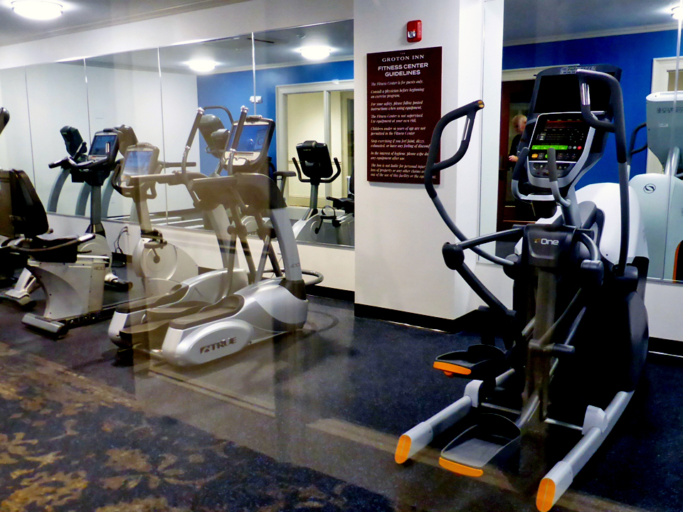 Exercise machines in the fitness center are equipped with with individual television screens.