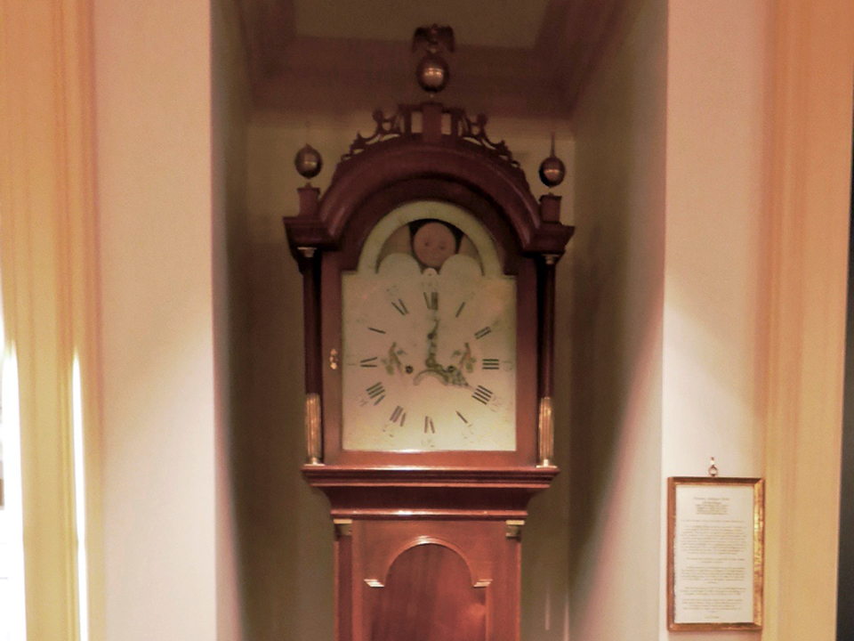 inlaid mahogany tall case clock made in Boston circa 1795, Groton Inn, Groton, Massachusetts