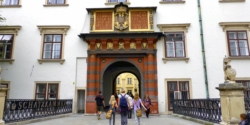 Habsburg collections are featured in the Imperial Treasuries, which is inside the oldest part of the palace, the 13th century Schweizerhof, named for the Swiss Guards once there. Some of the world’s most significant treasures are inside, including the Emperor’s Crown of the Holy Roman Empire (962 A.D.) the Crown of Emperor Rudolf II, a jeweled orb and scepter, and coronation robes. Other riches include the 15th century treasure of the Dukes of Burgundy, an 8th century Holy Lance, a 4th century agate bowl once thought to be the Holy Grail, the 8’ long horn said to be from a unicorn, and the Order of the Golden Fleece, the most-prestigious order of the Middle Ages.