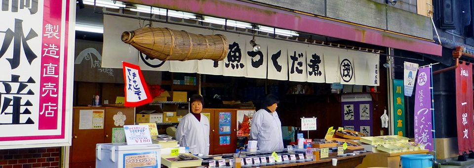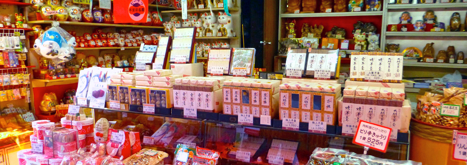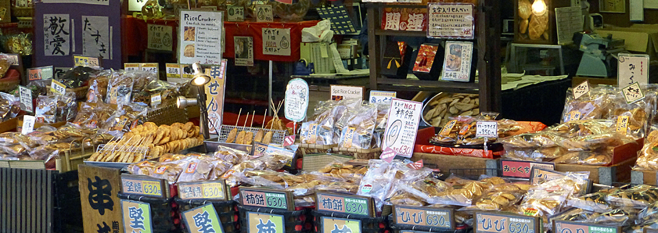 Two to three thousand rice crackers are baked daily and flavored with secret-recipe soy sauce at the 3rd generation, 100 year old shop named Hayashida. The crackers are made in several sweet and savory varieties, including those sold on a stick for 100¥ (about $1.25).