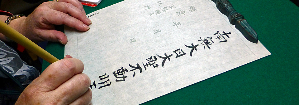 We wished for good karma from our shakyo (calligraphy) lesson with a Buddhist monk at the Naritasan Calligraphy Museum. First we cleansed ourselves with incense, bowed three times to the image of Fudomyoo, read the mind-calming sutra, assumed the prescribed hand position, and breathed deeply.