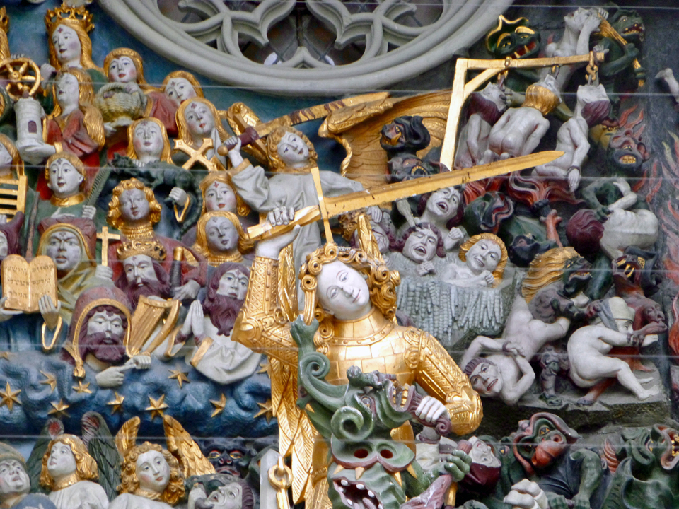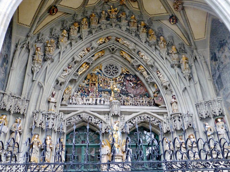 Bern Cathedral, known as Münster, was being renovated, but we stopped to admire the depiction of the Last Judgement above the entrance door.