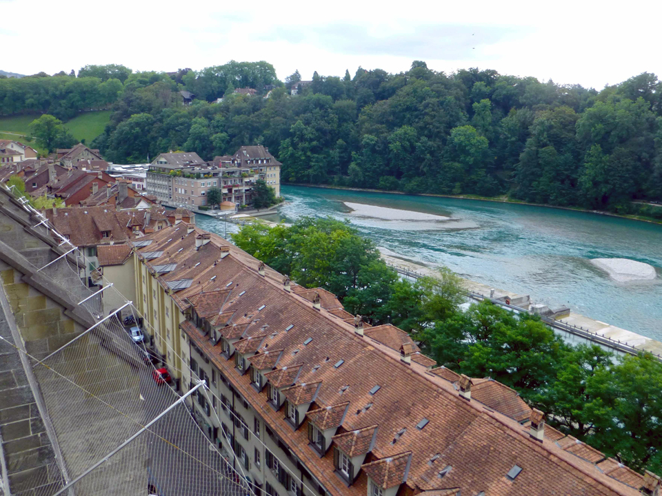 We used our Swiss Travel Pass for the tram from the train station right to the Hotel Allegro . Soon we were ready to head out along Kornhausstrasse, a street named for the former granary. We crossed a bridge spanning the Aare River and looked down the river toward the Botanical Garden. It was an unseasonably hot summer day and people were floating down the Aare River, enjoying the cool clear water from the Bernese Alps. Many carried their belongings in wet bags.