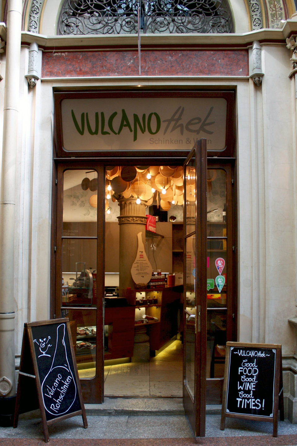 We sampled wine and a Brettljause platter of fine air dried ham, prosciutto and cheeses from the Styrian region of Austria in a deli and wine bar called Vulcanothek.