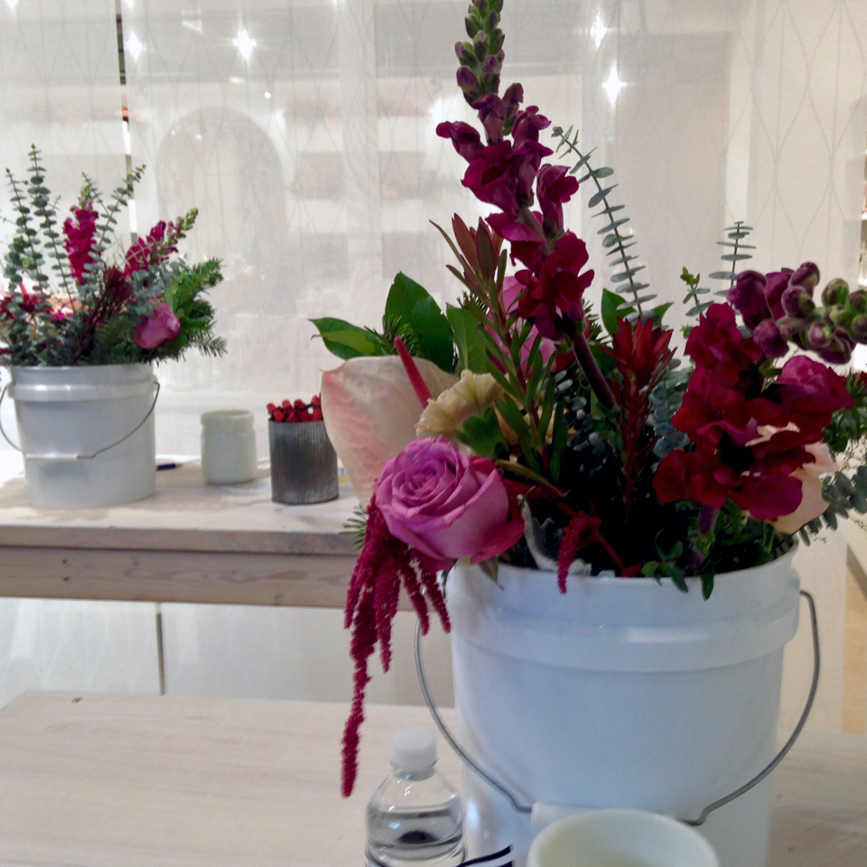 Our buckets contained about 40% greens, the backbone of the arrangement, for texture and interest. We learned about palette setters, statement florals or focal flowers, a whimsical element, and filler for the voids. Primary, secondary and tertiary  colors…it all sounds complicated but falls into place with a class like this one.