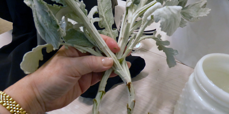 But first we needed to strip the stems of all leaves and needles that would be below water to minimize bacterial growth and keep the flowers fresher longer. We made a fresh cut on every stem, cutting at a 45 degree angle and below the knobby nodes to maximize water uptake. We were told to keep bacterial growth down by changing the water daily and recutting stems that show any darkening.