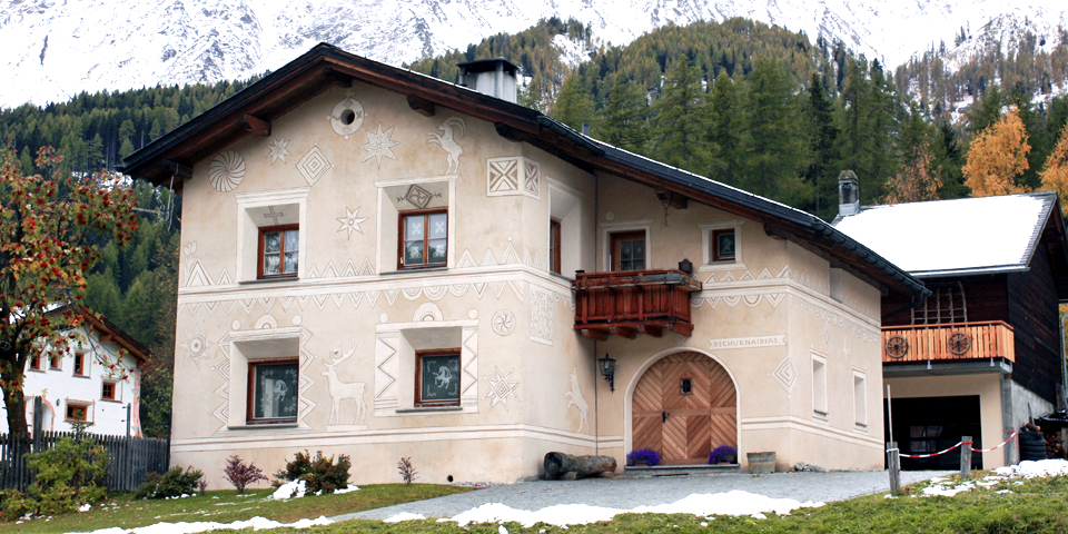 Val Müstair is a region of high mountains, lush, steep-sided valleys, alpine pastures, stone pine forests, and homes decorated with Engadine-style designs known as sgraffito.