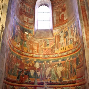 About a century ago, traces of rare Carolingian art were discovered and revealed to be the world’s largest series and best preserved early medieval frescoes. In 1492 the abbess renovated the buildings and had the frescoes covered with white paint to brighten the decor. Remnants of the original frescoes were discovered above the lowered ceiling by a researcher at end of nineteenth century and were completely uncovered by 1951. The convent was named a UNESCO World Heritage site in 1983.