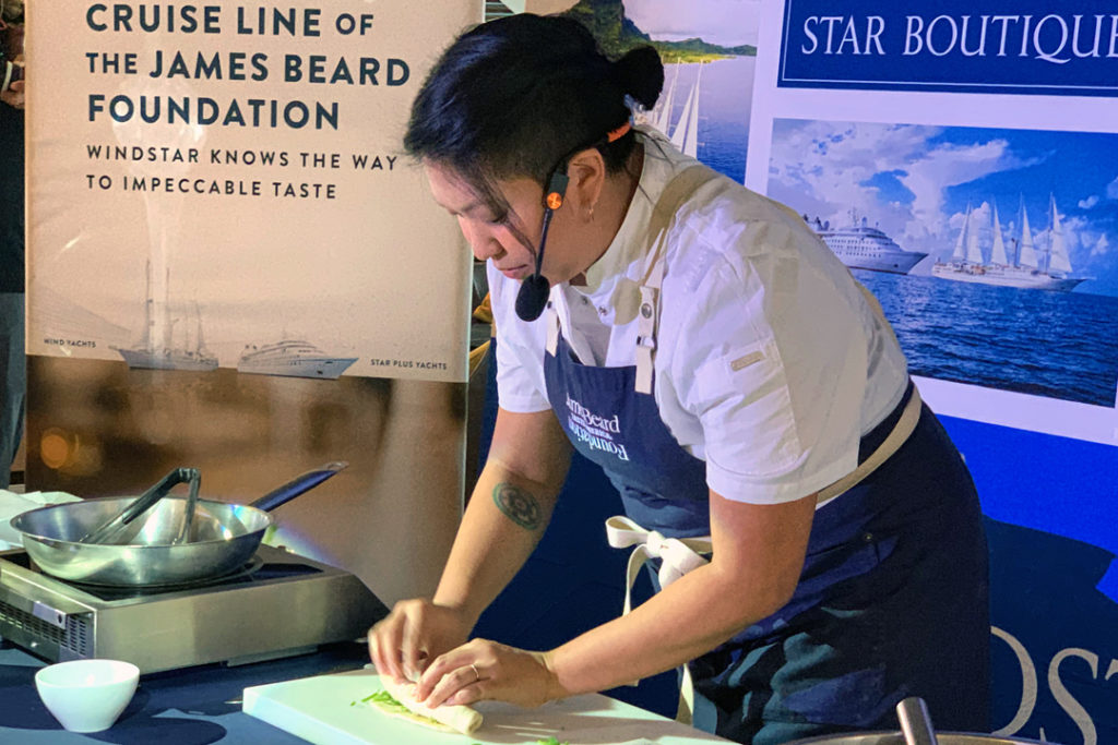 Boston Chef Irene Li completed her first cruise as guest chef aboard the 312-passenger Star Pride in October, 2022. She demonstrated the steps and revealed secrets for making Scallion Pancakes, which she called an iconic representation of growing up Chinese in Boston. Her Coconut Dashi Clam Chowder with kombu and fresh ginger is a favorite with guests both as a starter and as a dessert.