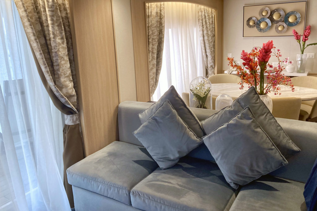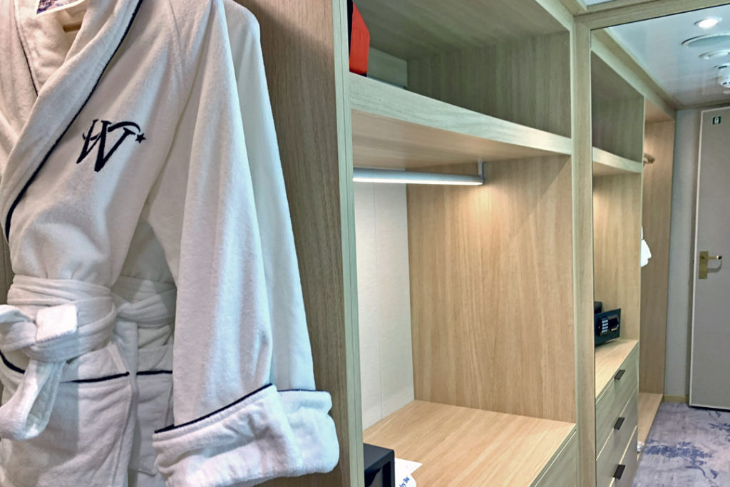 Cabins have ocean views and are spacious, with at least 277 square feet of space, allowing for separate sleeping and sitting areas. Watersport are available right from the platform on the back of the ship.